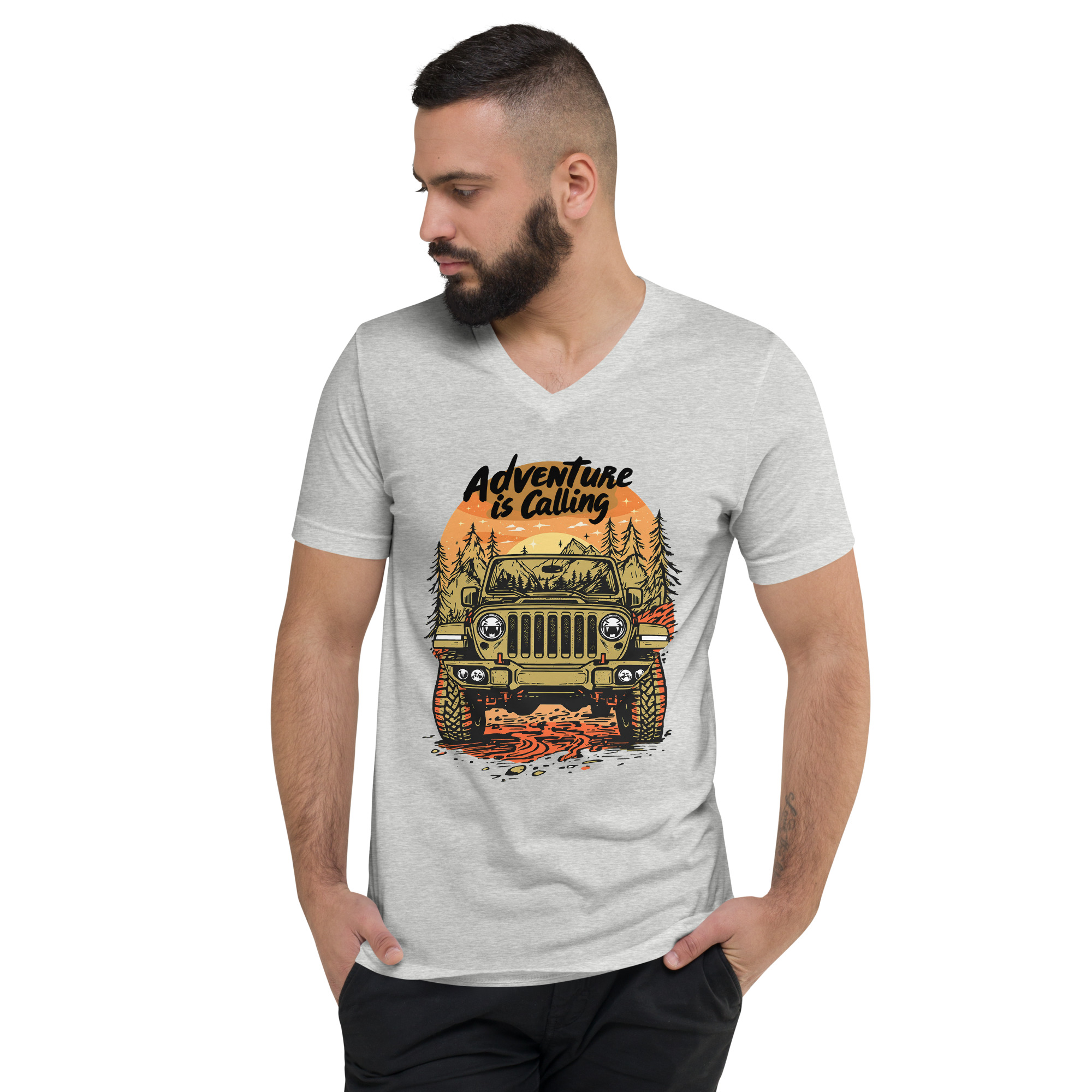 Elevate your camping style. A comfortable v-neck off-road shirt featuring a detailed front-facing vintage rig.