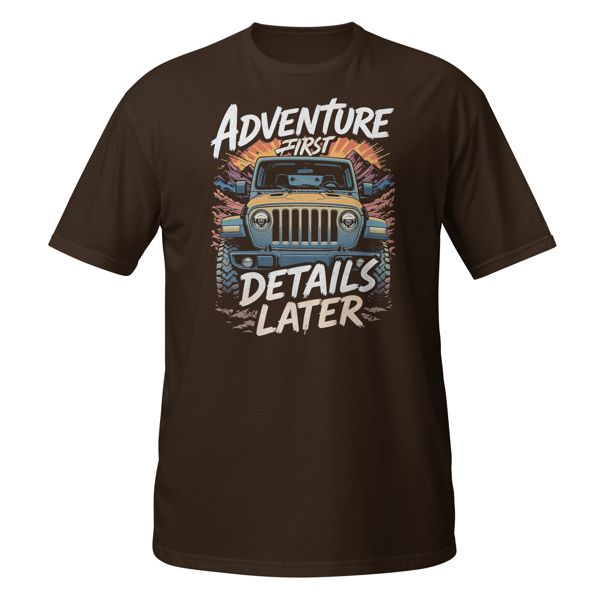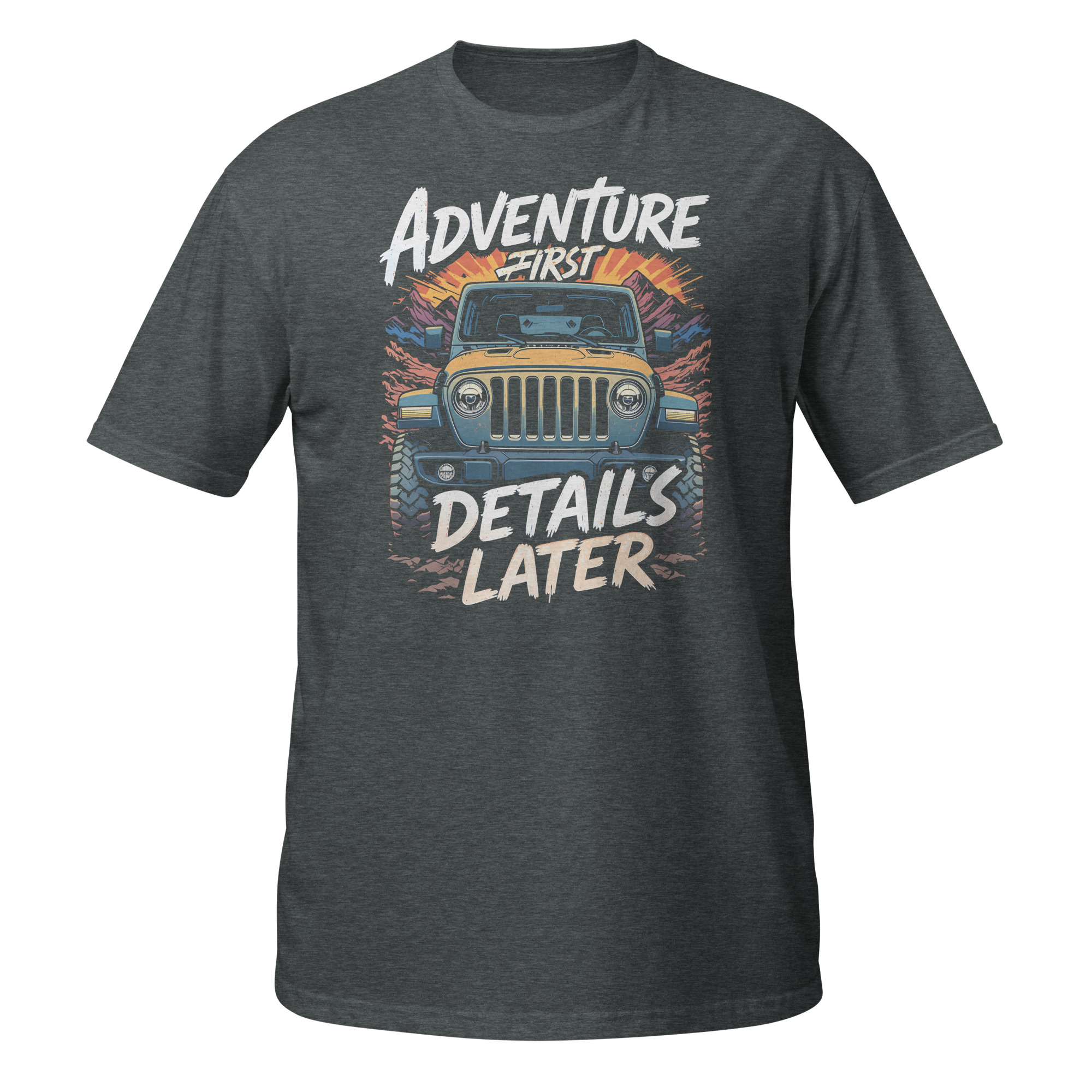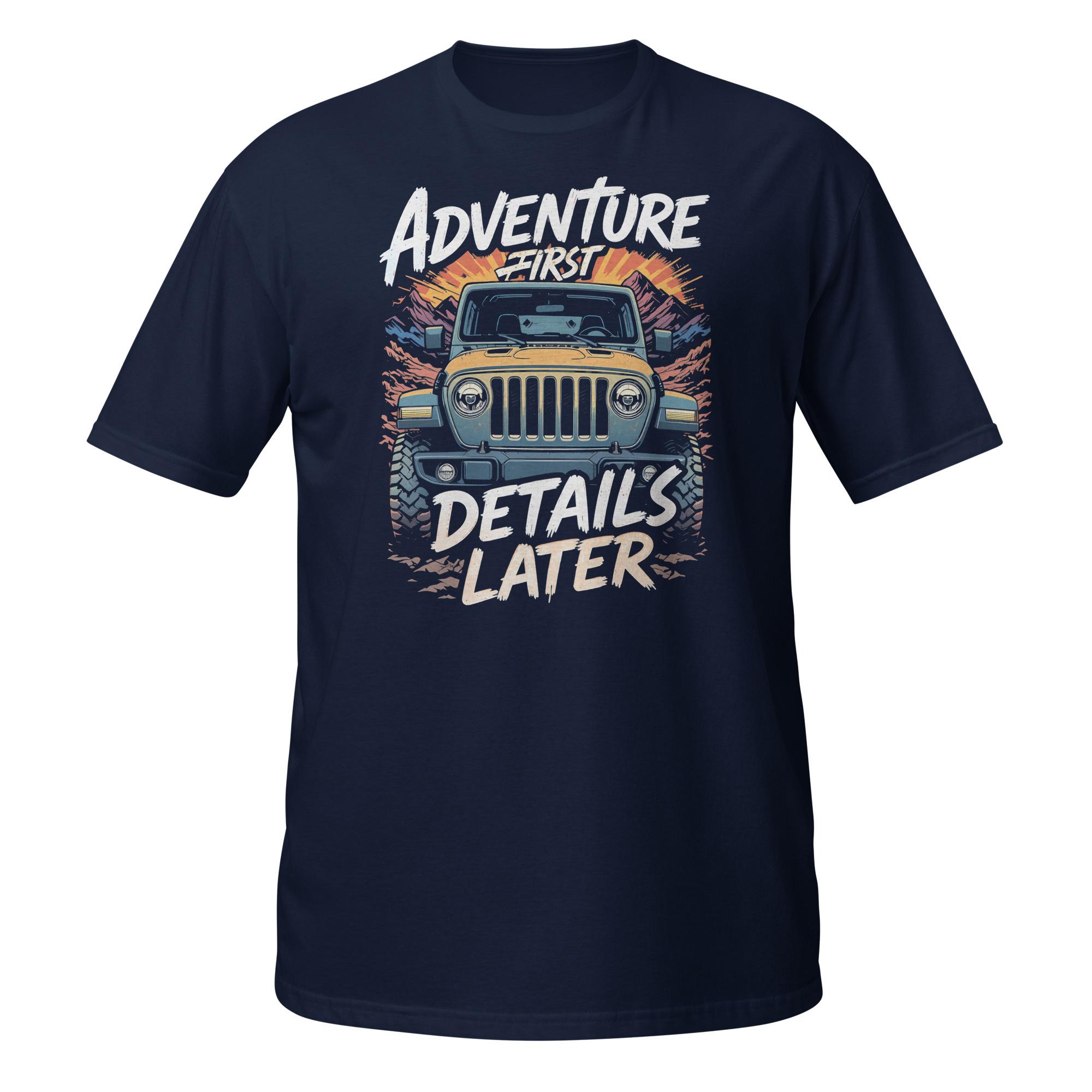 This striking apparel seamlessly merges bold comic aesthetics with modern durability. Pair it easily with your favorite heavy canvas pants or tactical cargo shorts. The highly breathable, naturally sourced cotton fabric ensures you remain completely comfortable during intense desert drives. If you are passionate about extreme off-roading, the distressed Adventure First Details Later slogan lets everyone know exactly where your heart lies.