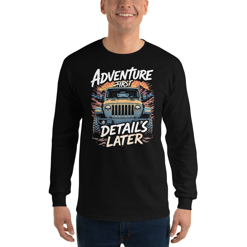 This striking apparel seamlessly merges classic pop-art aesthetics with modern durability. Pair it easily under a heavy vest or worn solo with tactical cargo pants. The highly breathable, naturally sourced cotton fabric ensures you remain comfortable during breezy desert drives. The distressed Adventure First Details Later slogan lets everyone know exactly where your heart lies.